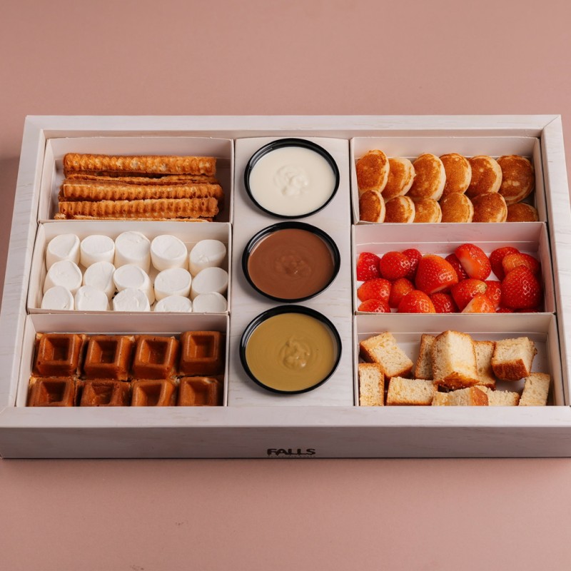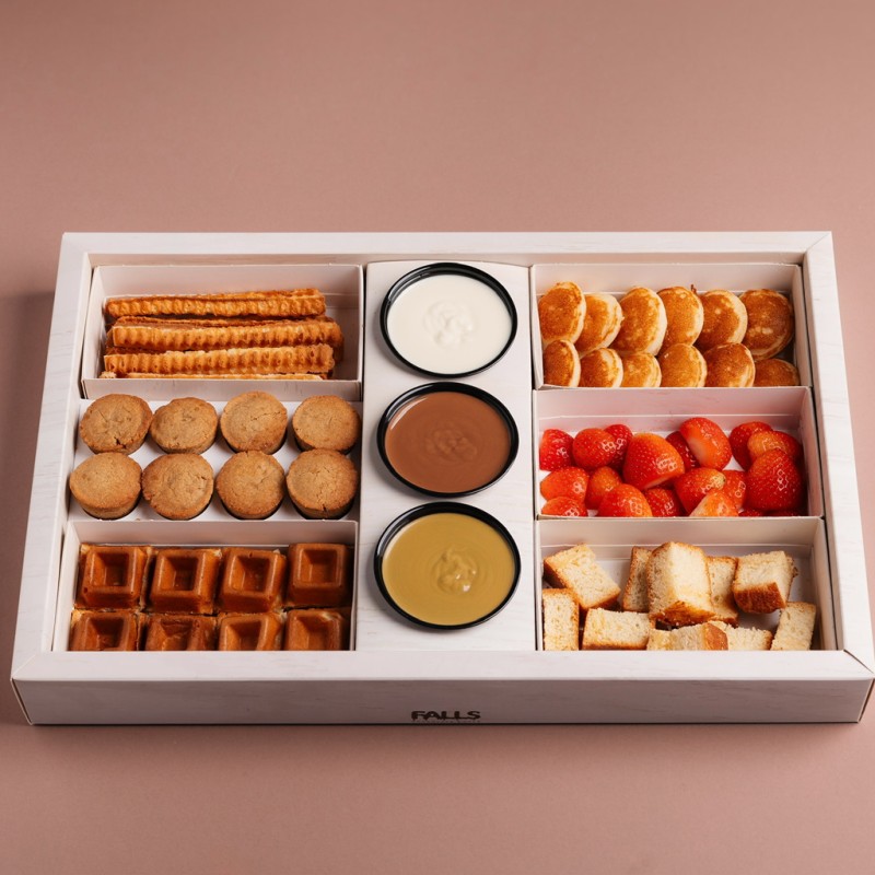 بوكس مناسب لجمعاتم لحفلاتكم لمناسباتكم السعيدة ..يحتوي البوكس على أربع اصناف من الذ انواع الحلا لدينا وافل فرايز -ميني وافل -ميني بانكيك مع الفراولة الطازجة وحلوى المارشميللو ويحتوي على 3 أنواع من الصوصات على حسب اختياركم