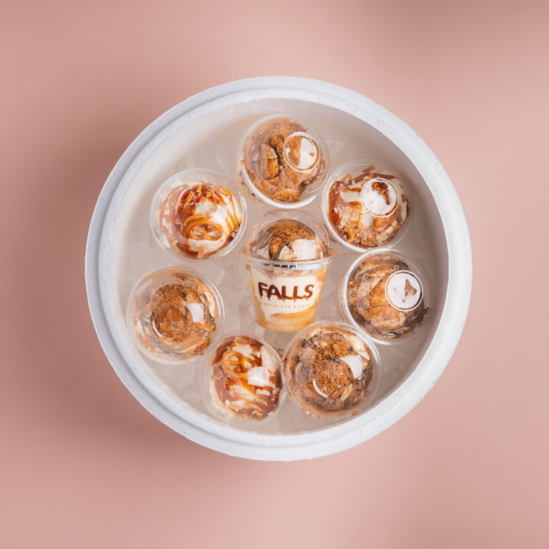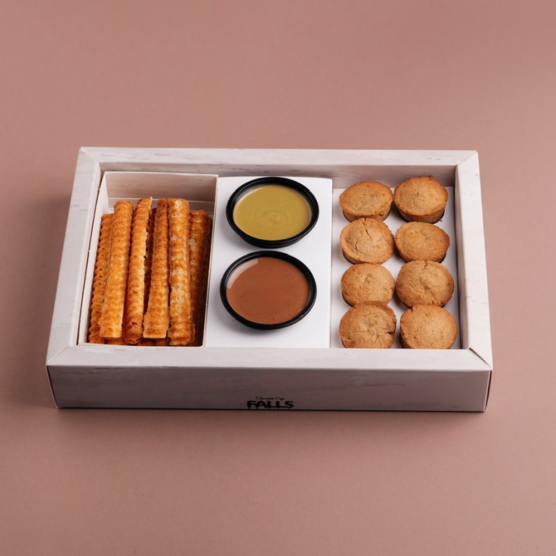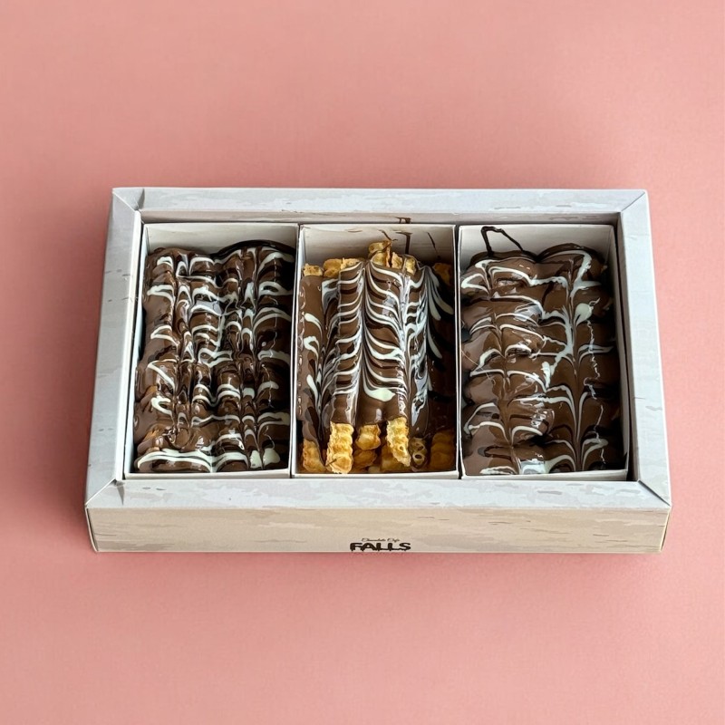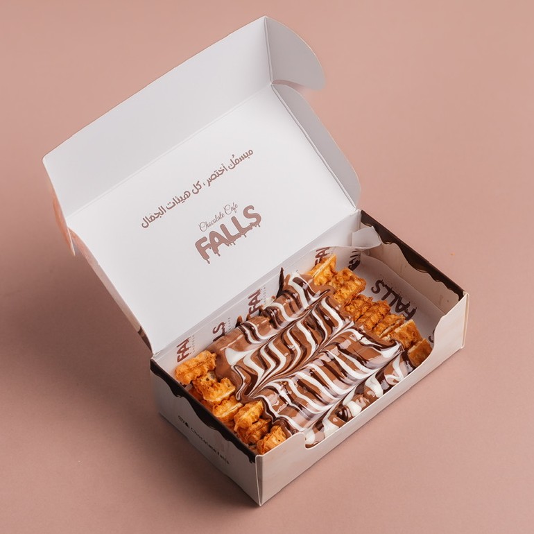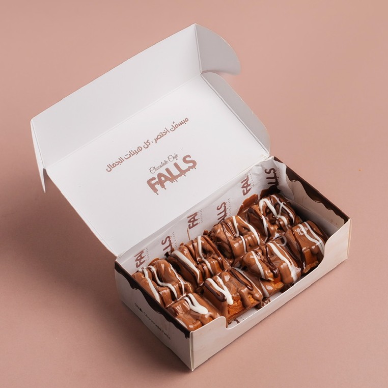 بوكس يحتوي على ثلاث أنواع من أفضل المنتجات لدينا .. وافل فرايز و ميني وافل وميني بانكيك مغطى بالشوكولاته البلجيكية الفاخرة